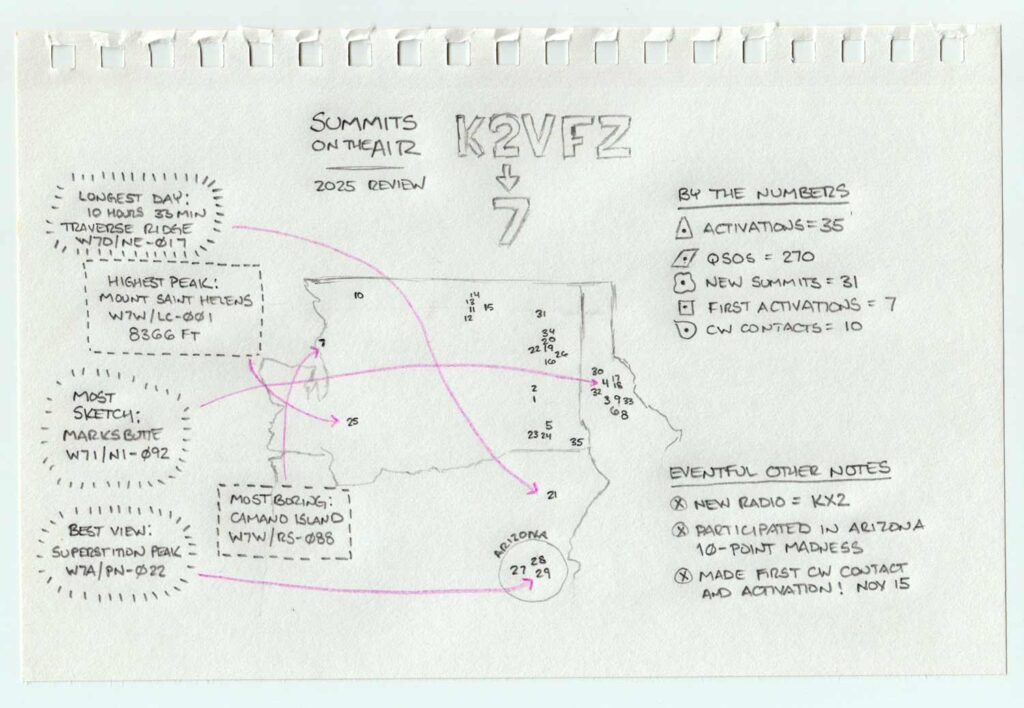 My second year of Summits on the Air was a solid effort. Along with dialing in my radio kit and just straight pumping up my numbers, the magnitude of mountains tackled was generally more impressive and technical. I bagged my first 10-pointer this year… three of them in three different states, in fact.